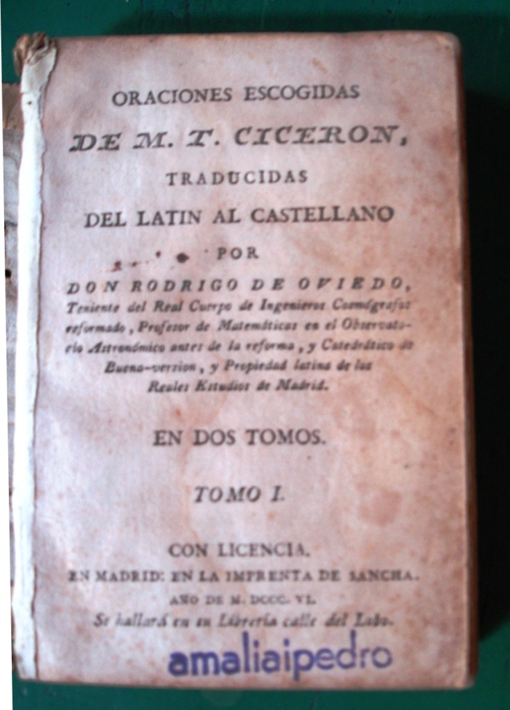 Uno de los más antiguos que tengo me fue regalado en Alicante por mis tíos Pedro González Guillén y Amalia Miquel Alcaraz, en julio de 1980. Se trata del primer tomo (de dos) de las Oraciones escogidas de Cicerón, traducidas por Rodrigo de Oviedo y publicadas en Madrid en la imprenta de Sancha, el año de M.DCCC.VI. Se trata de una edición en octavo menor (10 x 15 cm), encuadernada en pergamino, bilingüe (latín/castellano), que contiene los textos ciceronianos “En favor de la Ley Manilia”, “Contra Lucio Catilina”, “En defensa de Aulio Licinio Archias”, “Después de la vuelta al pueblo” y “Después de la vuelta al senado”, además de una dedicatoria, un prólogo y unas anotaciones finales del traductor.