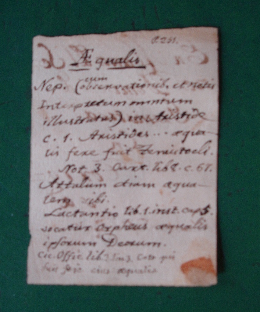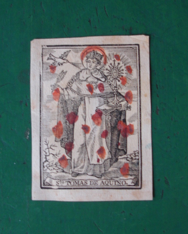 Este ejemplar, en efecto, sirvió como libro de texto. Al final, en una hoja blanca pegada al pergamino, un anónimo estudiante apuntó las páginas de las cláusulas latinas difíciles, las de nombres propios y las de sentencias notables; también un pequeño recorte de papel resguardado en el interior consigna anotaciones que daban fe de sus empeños por dominar la lengua. Junto a ese recorte, una estampa de Santo Tomás de Aquino atacada por una buena cantidad de manchas rojas indica, tal vez, sus maniobras para aligerar los excesos de tinta en la pluma… o simple aburrimiento.