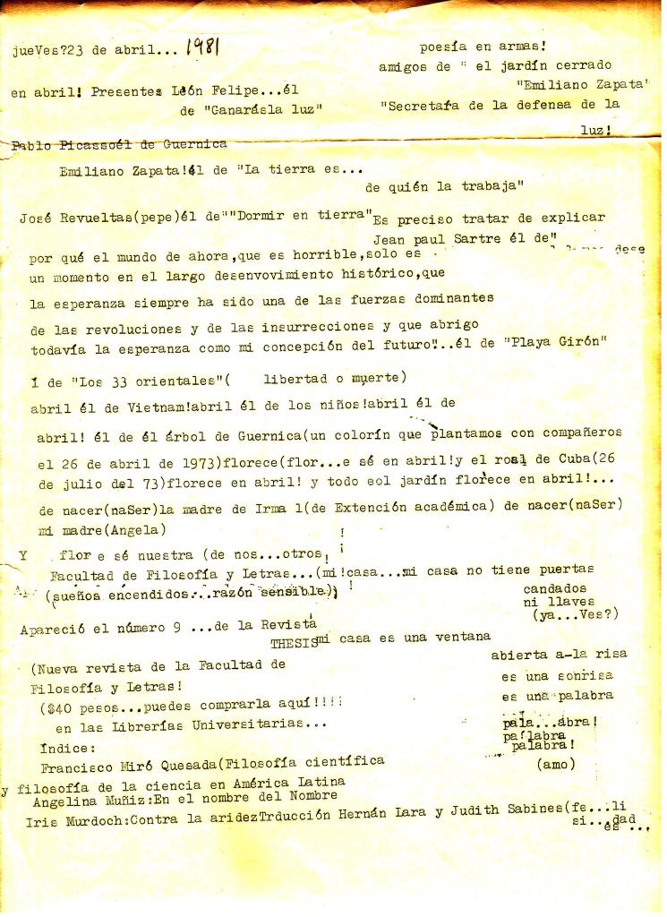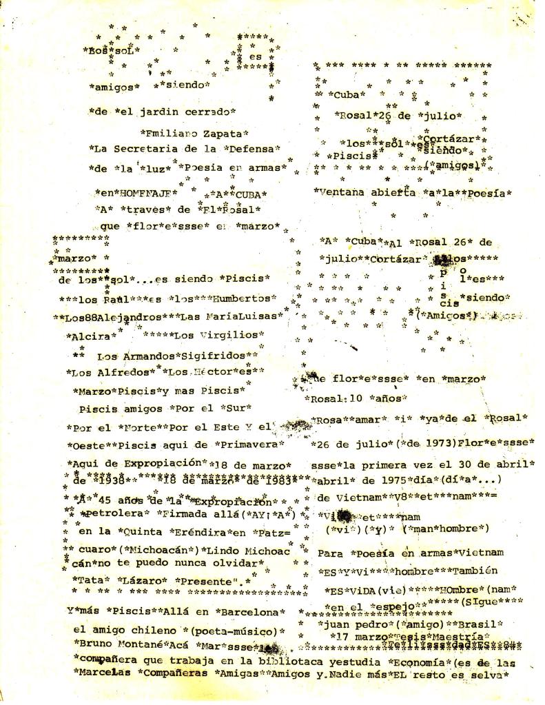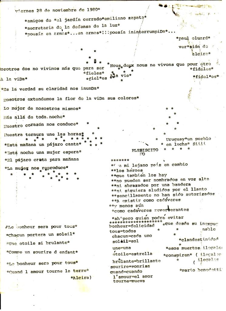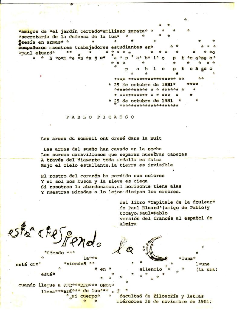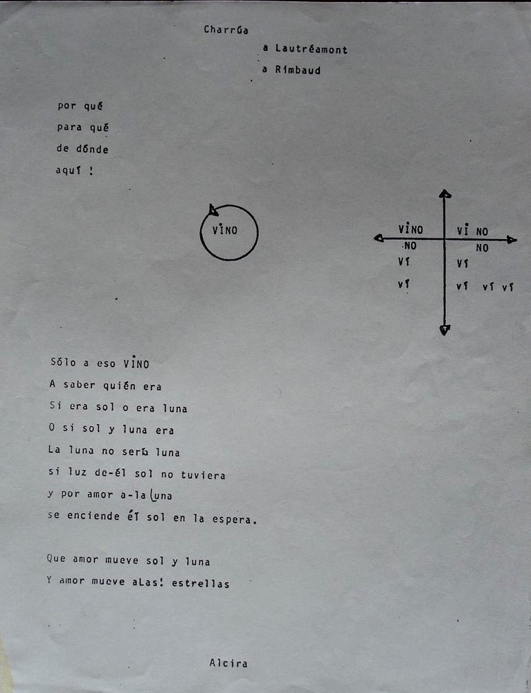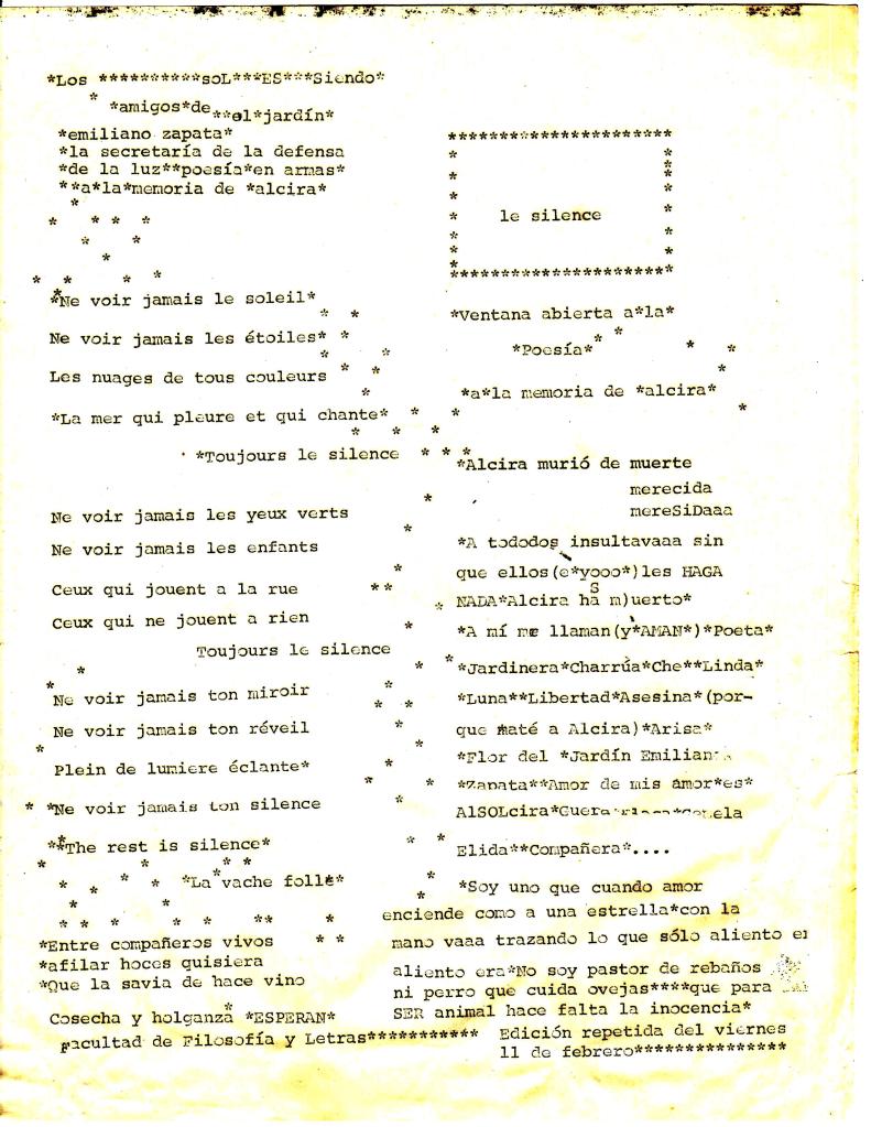 Las hojas mimeografiadas de Alcira se hicieron de aparición frecuente y en 1974 su encabezado rezaba: “Publicaciones diarias de Poesía en Armas”. Su contenido se amplió para incorporar noticias, citas, saludos, grafitis y dibujos, volviéndose al mismo tiempo diario íntimo, periódico comunitario y obra visual en la que se exploraban las posibilidades expresivas de la escritura sobre el esténcil. Utilizado en los años setenta y ochenta por los artistas de los grupos Proceso Pentágono y Suma como medio de producción de obra gráfica, así como por diversos grupos políticos como eficiente vehículo de agitación y propaganda, el mimeógrafo tuvo en ella un sorprendente alcance cultural. De acuerdo con Cuauhtémoc Medina,
