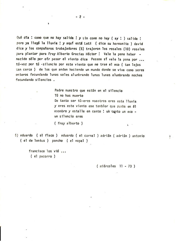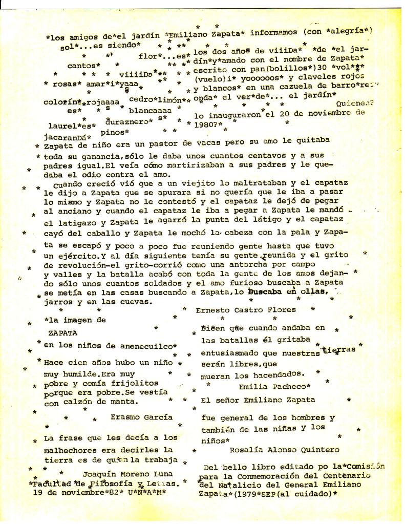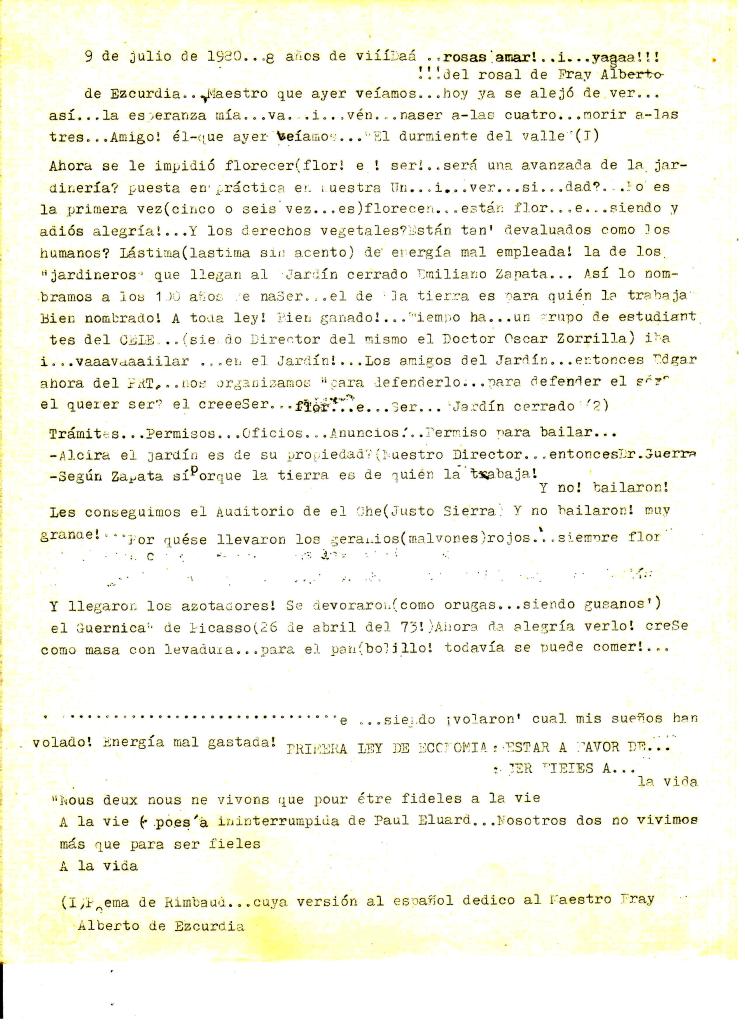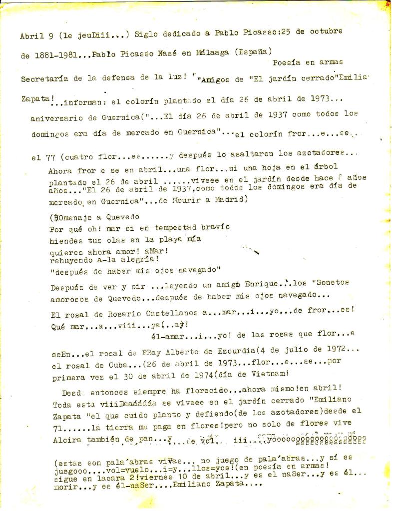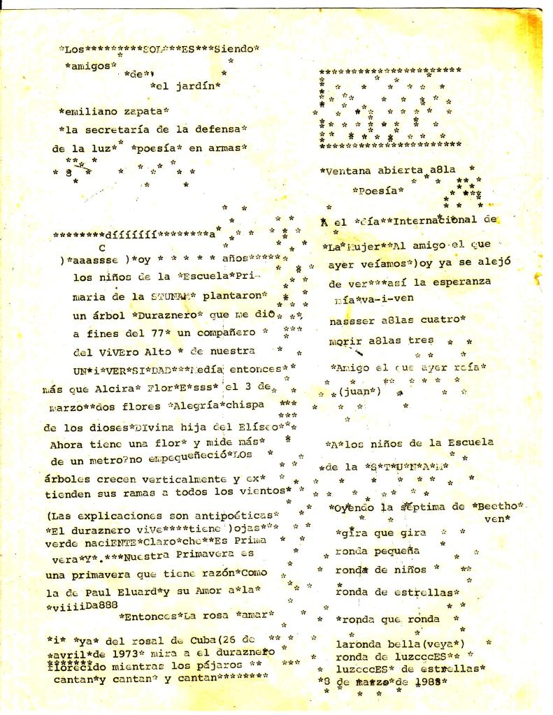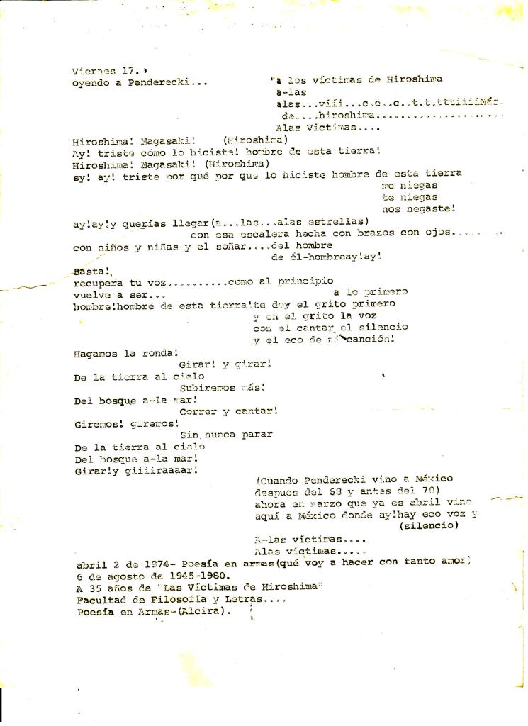 Las hojas mimeografiadas de Alcira se hicieron de aparición frecuente y en 1974 su encabezado rezaba: “Publicaciones diarias de Poesía en Armas”. Su contenido se amplió para incorporar noticias, citas, saludos, grafitis y dibujos, volviéndose al mismo tiempo diario íntimo, periódico comunitario y obra visual en la que se exploraban las posibilidades expresivas de la escritura sobre el esténcil. Utilizado en los años setenta y ochenta por los artistas de los grupos Proceso Pentágono y Suma como medio de producción de obra gráfica, así como por diversos grupos políticos como eficiente vehículo de agitación y propaganda, el mimeógrafo tuvo en ella un sorprendente alcance cultural. De acuerdo con Cuauhtémoc Medina,