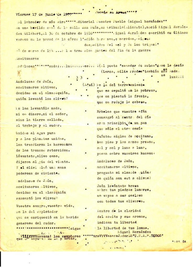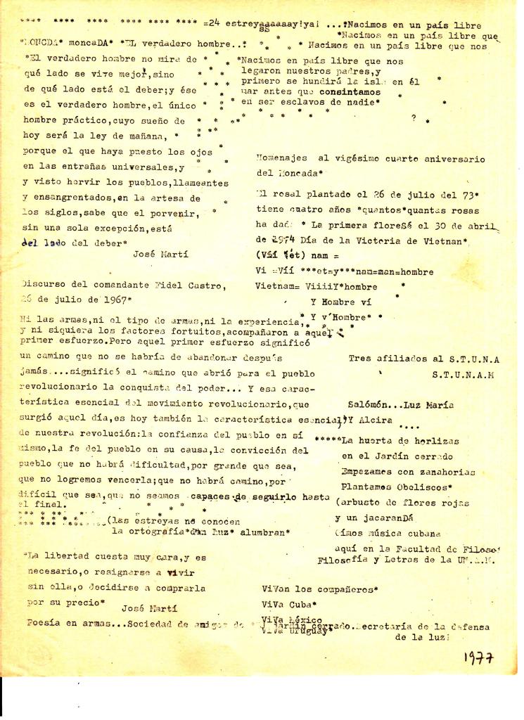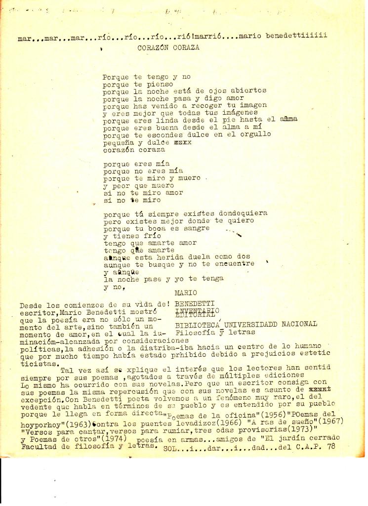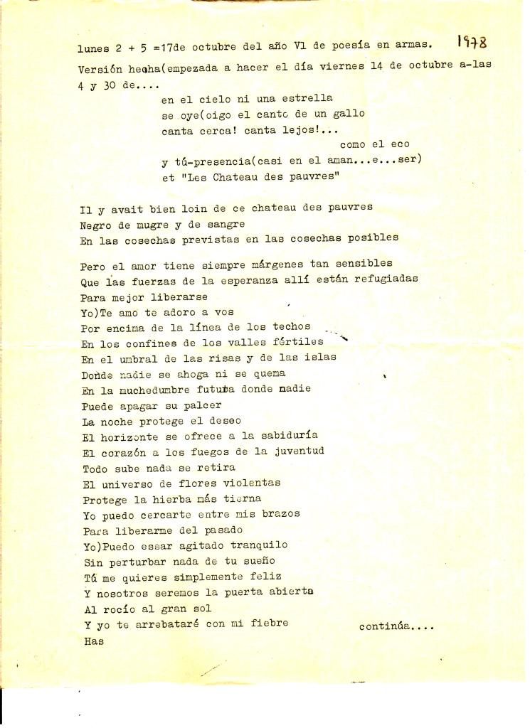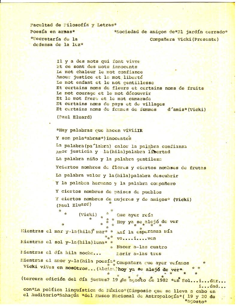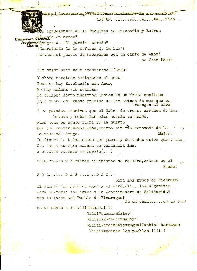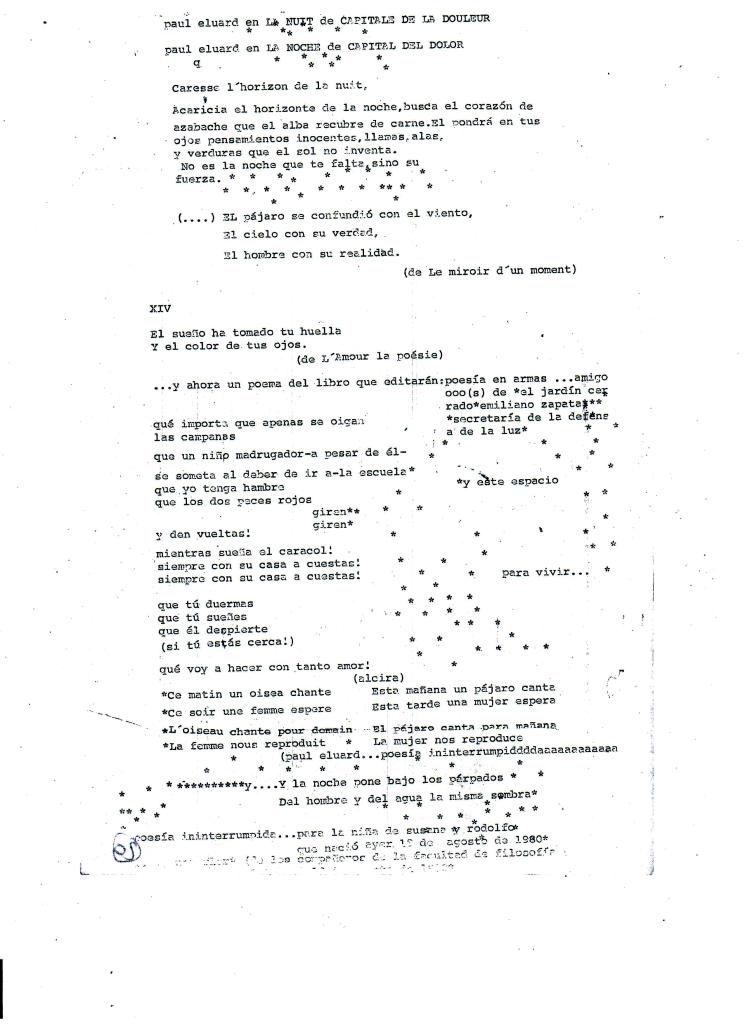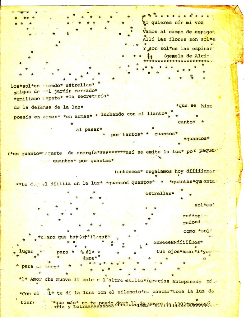 Poesía en Armas aparecía así como la continuación del derrame de agitación política de esa clase de impresión barata e implícitamente desechable, para propiciar una sublevación de emociones, referentes y lenguaje. Adicionalmente, el mimeógrafo facilitaba a Alcira la proximidad de un género epistolar dirigido a una multitud relativa. Esta intimidad es lo que estaba involucrado en pensar la escritura como una evocación cristológica de los panes.