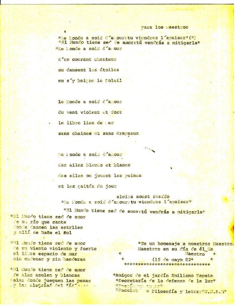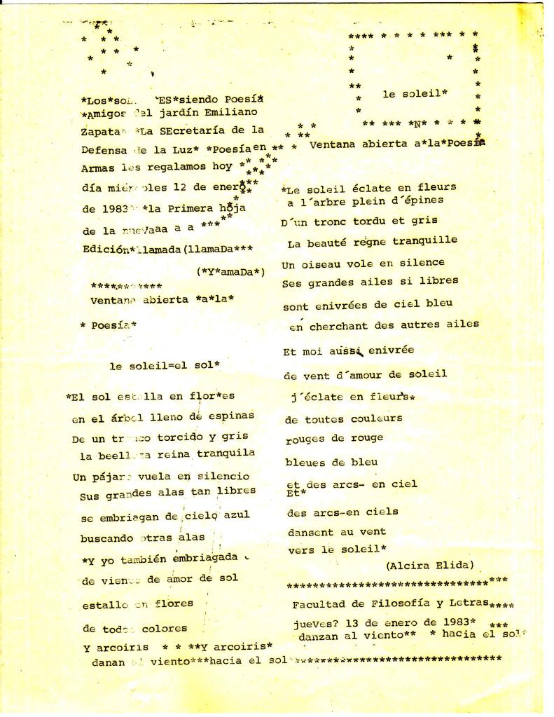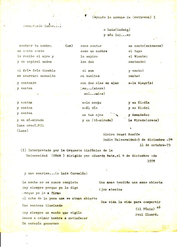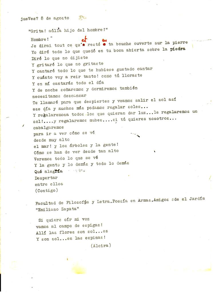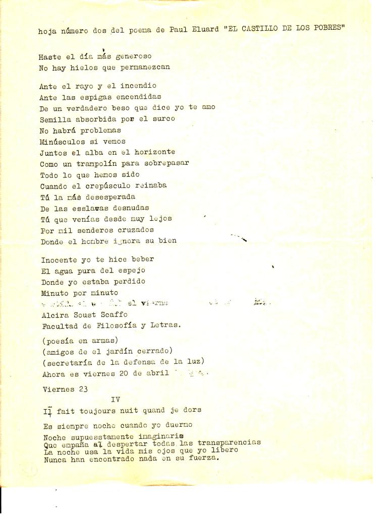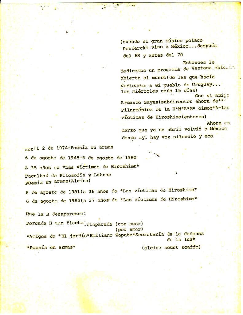 Sería de esperar que, como uno de los resultados de los loables esfuerzos para recordar a la poeta y pintora hechos recientemente en México y Uruguay por la familia Gabard Soust, Antonio Santos, Amanda de la Garza, Inés Trabal, Carlos Landeros, Cuauhtémoc Medina, Julio Dozal y otras personas, pronto sean accesibles los poemas y traducciones completos de Alcira. Para eso resulta indispensable reunir una colección de las hojas que creó, con admirable constancia, durante más de tres lustros. Algunas piezas se reproducen, con dibujos y manuscritos contemporáneos, en el excelente catálogo de la exposición Alcira Soust Scaffo. Escribir poesía ¿vivir dónde? (MUAC-UNAM, México, 2018, con edición electrónica de acceso libre) y otras en una página de Facebook con el nombre de la artista. Con el fin de contribuir a completar y ordenar ese corpus, se presentan a continuación 46 piezas, organizadas de manera cronológica excepto la primera y las dos últimas, que no se han podido fechar.