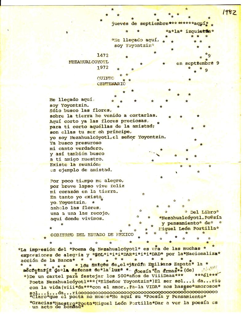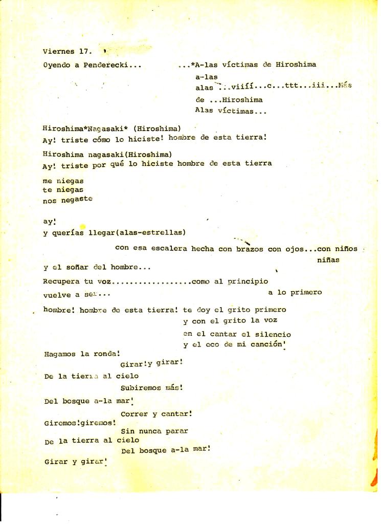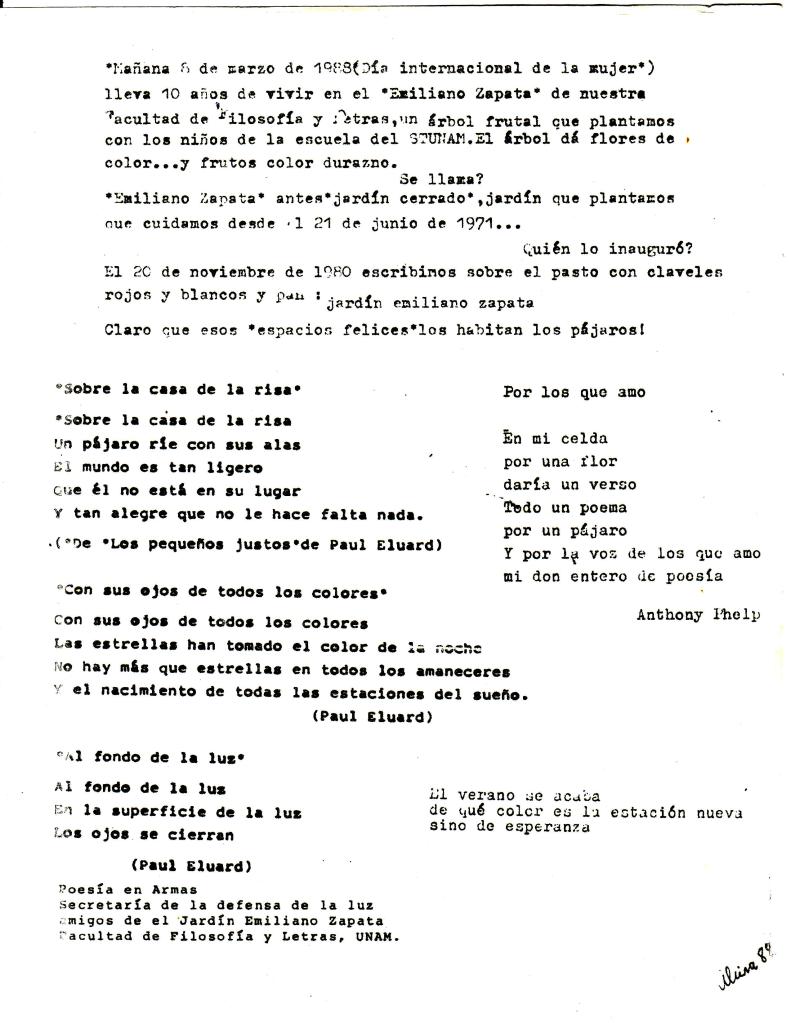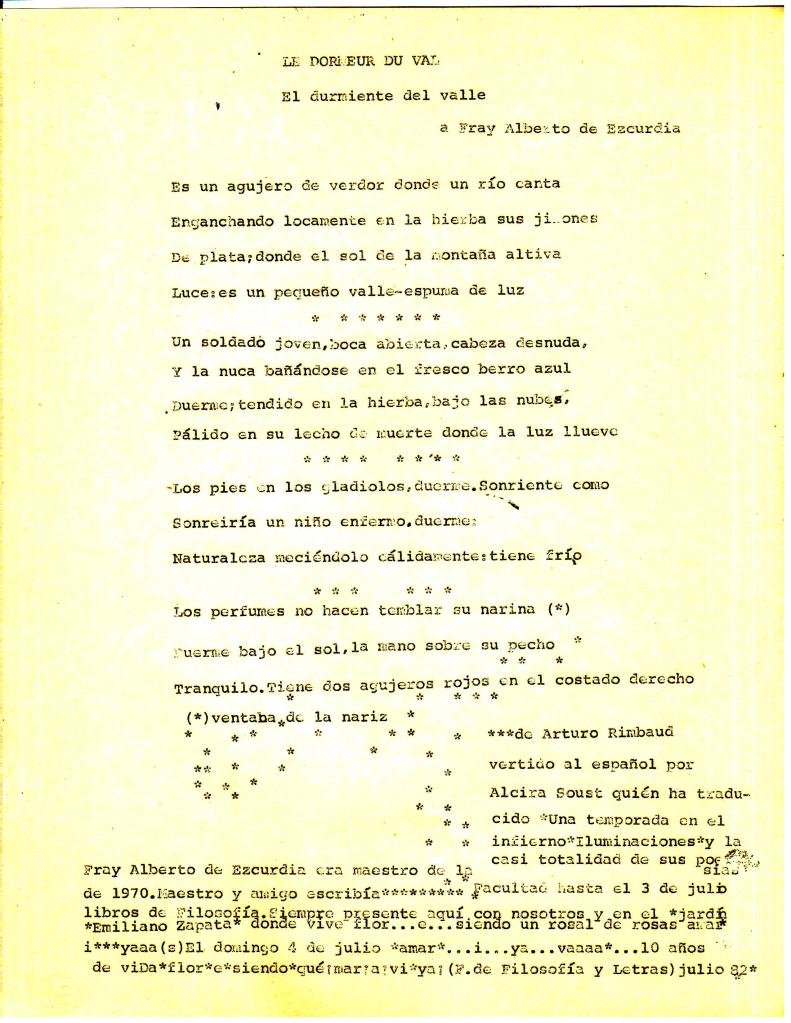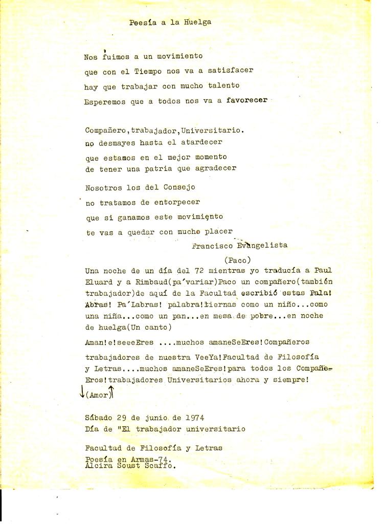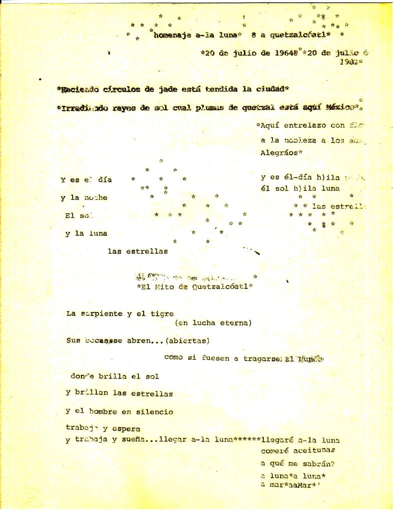 Sería de esperar que, como uno de los resultados de los loables esfuerzos para recordar a la poeta y pintora hechos recientemente en México y Uruguay por la familia Gabard Soust, Antonio Santos, Amanda de la Garza, Inés Trabal, Carlos Landeros, Cuauhtémoc Medina, Julio Dozal y otras personas, pronto sean accesibles los poemas y traducciones completos de Alcira. Para eso resulta indispensable reunir una colección de las hojas que creó, con admirable constancia, durante más de tres lustros. Algunas piezas se reproducen, con dibujos y manuscritos contemporáneos, en el excelente catálogo de la exposición Alcira Soust Scaffo. Escribir poesía ¿vivir dónde? (MUAC-UNAM, México, 2018, con edición electrónica de acceso libre) y otras en una página de Facebook con el nombre de la artista. Con el fin de contribuir a completar y ordenar ese corpus, se presentan a continuación 46 piezas, organizadas de manera cronológica excepto la primera y las dos últimas, que no se han podido fechar.