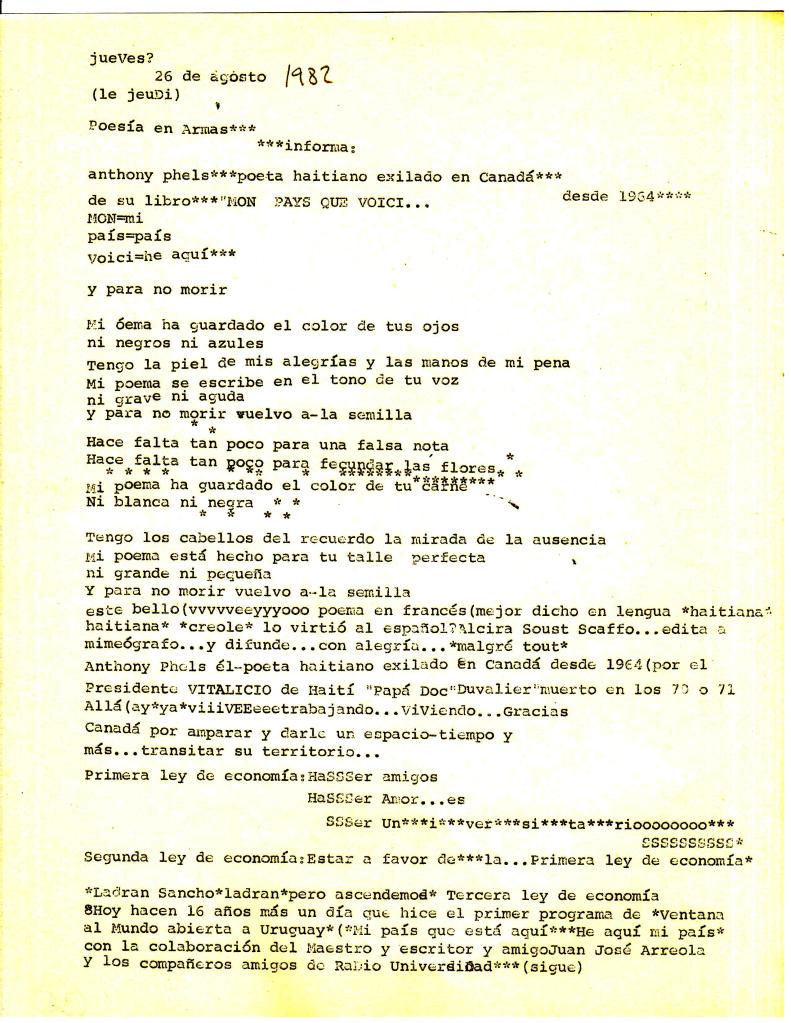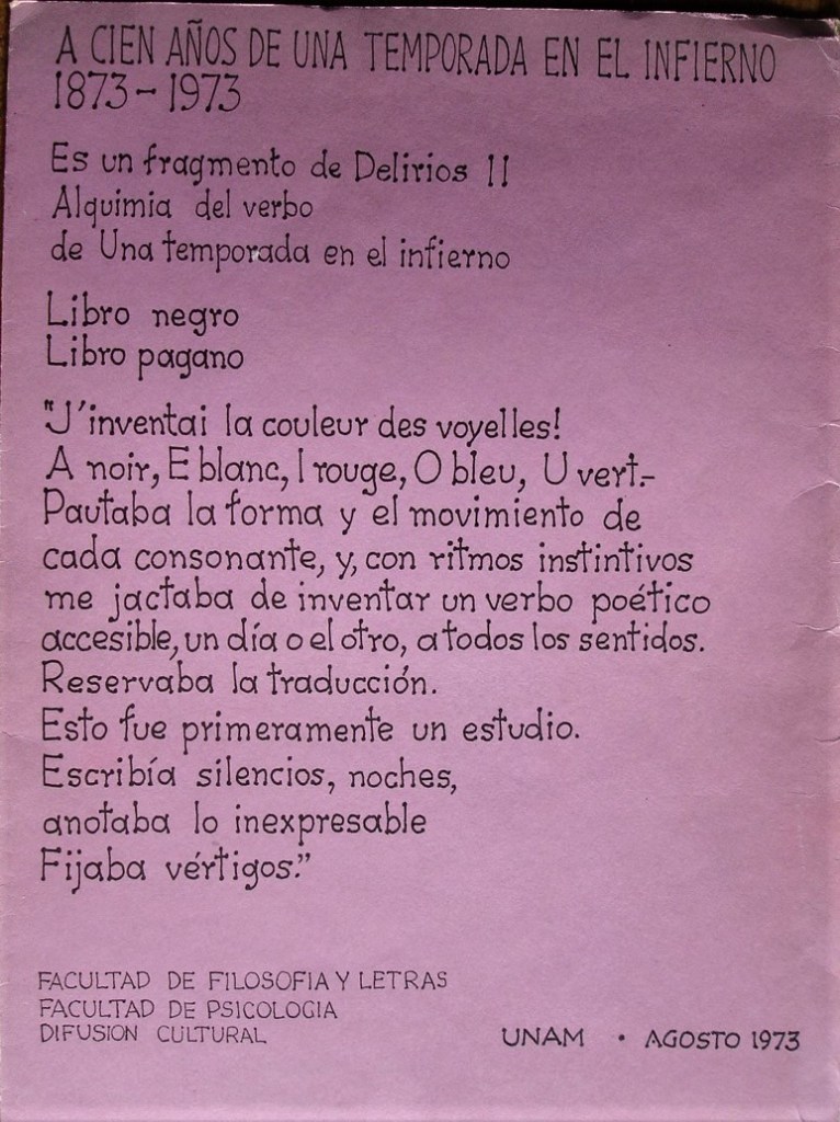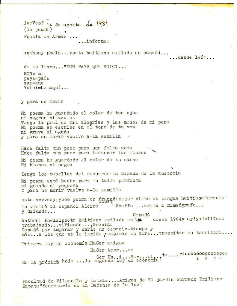 1972 fue designado por ella Año de la Poesía en Armas. Comenzó entonces a distribuir unas hojas impresas en mimeógrafo que contenían sus traducciones. Ese año aparecieron “El barco ebrio” de Arthur Rimbaud y “Poesía para acompañar la noche de una recitación en honor del mar” de Saint-John Perse. Pero el calendario había sido transformado y en los siguientes años de Poesía en Armas las hojas incluyeron piezas de Paul Éluard, Lautréamont, Charles Baudelaire, Birago Diop, Jean Sénac, Anthony Phelps y –de nuevo– Rimbaud; también se copiaron ahí poemas de Mario Benedetti, José Martí, Rafael Alberti, Pablo Neruda, Nicolás Guillén, Alfonsina Storni, Miguel Hernández y Rosario Castellanos,