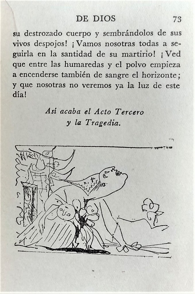 Es posible que Bergamín conservara una impresión de esa obra y que de ahí se tomaran las imágenes que se reproducen en la portadilla y cuatro páginas interiores del libro, por cierto al revés; en cualquier caso, con su dramático simbolismo resultaron más adecuadas que los motivos vegetales de los otros volúmenes para acompañar las tragedias protagonizadas por mujeres en tiempos de la Guerra Civil, que el autor dedicó “a los mártires de mi Patria; a sus mujeres, madres, esposas, hijas, hermanas sacrificadas: a tan pura y piadosa sangre entrañablemente generadora del heroico pueblo español”.