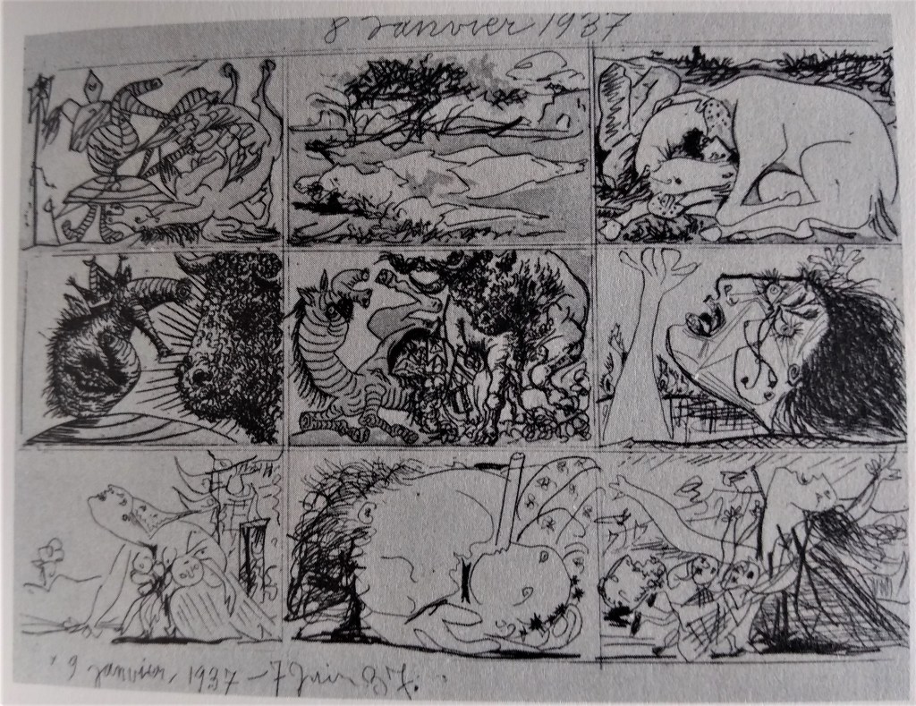 Junto con Josep Renau, Max Aub, Luis Lacasa y Juan Larrea, Bergamín había integrado el grupo que visitó a Picasso en su casa de París, a principios de 1937, para transmitirle la solicitud del gobierno de la República de que pintara un gran cuadro o mural en el pabellón español de la Exposición Internacional de París en verano de ese año. El encargo, que culminó en la creación del célebre Guernica, dio lugar también a una buena cantidad de productos hechos por el prolífico Picasso. Escribió Josep Palau i Fabre que podía por eso considerarse al Guernica “como un cuadro aureolado con una serie de dibujos y grabados que lo preparan, lo acompañan, lo orquestan o lo siguen, como satélites de un gran sistema solar” (p. 79). Las piezas aparecidas en el libro de Bergamín pertenecían a ese conjunto: habían sido incluidas en una plancha dividida en nueve secciones, titulada como otra anterior de estructura idéntica Sueño y mentira de Franco, y fechada en enero y junio de 1937.