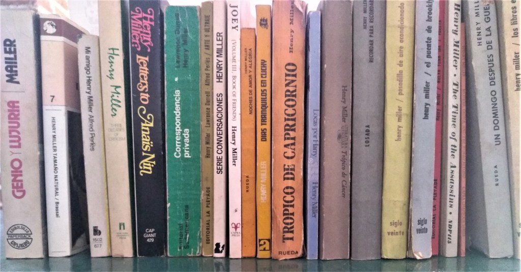Creo que fue en la librería El Juglar donde me topé con un ejemplar de la traducción de Trópico de Capricornio editada en Buenos Aires por Santiago Rueda. Lo leí de un tirón y pronto seguí con Trópico de Cáncer, Noches de amor y alegría, Días tranquilos en Clichy, la trilogía La crucifixión rosada, El coloso de Marusi, y también los ensayos y cartas de Miller, las entrevistas que le hicieron, así como los libros que sobre él publicaron Alfred Perlès, Norman Mailer y Brassaï. Miller fue el primer escritor –acompañado más adelante por uno o dos más– de quien quise leer, y poseer, su producción completa. En una revisión de lo que, tras préstamos a amigos y otros naufragios, aún queda de esas obras en mi biblioteca, descubro que todos los ejemplares fueron publicados en la década de los setenta –en otras palabras, que ese apasionamiento fue un pecado cometido fundamentalmente en mi primera juventud.
