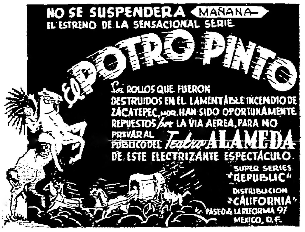 La copia de El potro pinto quemada en Zacatepec se había programado para exhibirse después en el Teatro Alameda de la Ciudad de México. Los empresarios publicaron un anuncio en el que informaban que los rollos perdidos habían sido “oportunamente repuestos por vía aérea para no privar al público (…) de este electrizante espectáculo” (Excélsior, 10 de junio de 1939, p. 10). El estreno en la capital se realizó apenas una semana después de la tragedia. El show debía seguir.