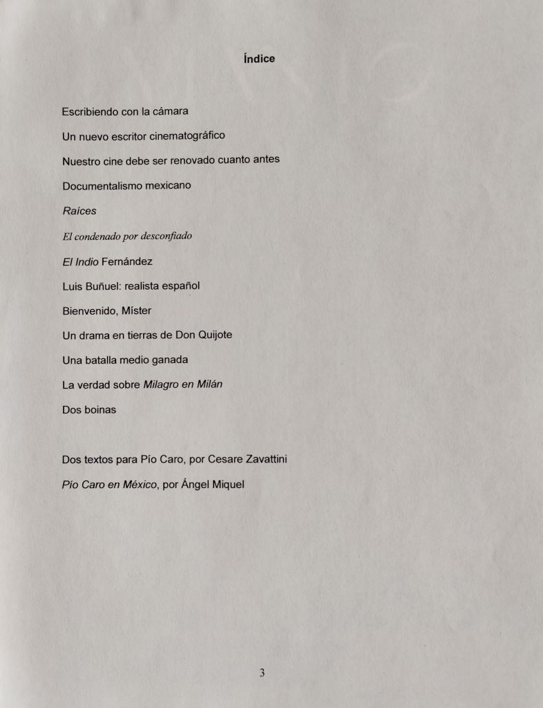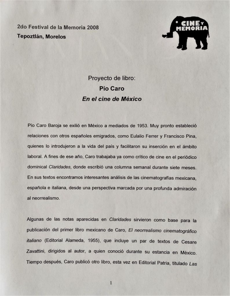 El encuentro casual de un libro en la Biblioteca del Orfeó Catalá de la Ciudad de México me llevó a recordar hace unos días un proyecto no realizado. El libro es El neorrealismo cinematográfico italiano publicado por la Editorial Alameda capitalina en 1955 y el proyecto uno dedicado a homenajear a su autor, Pío Caro, en el Festival de la Memoria de 2008.