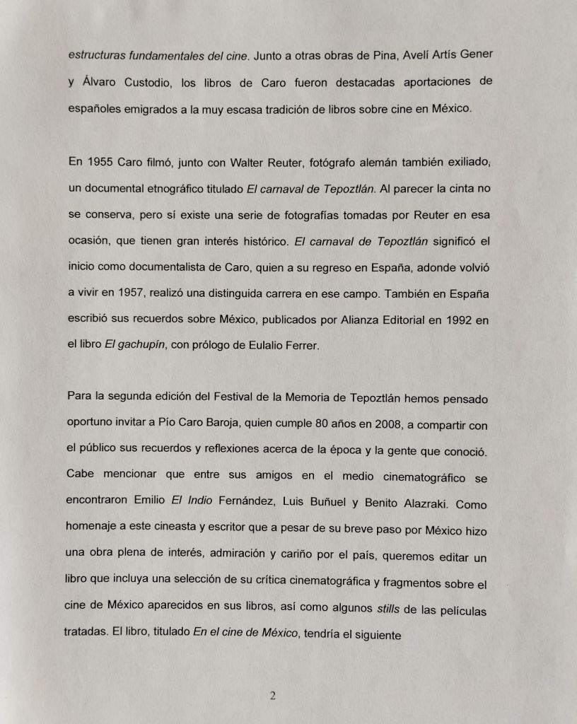 Quedé encargado de buscar El carnaval de Tepoztlán para exhibirla en el Festival y también de armar un libro con textos de Pío Caro que se regalaría a los asistentes. La película no estaba en la Cineteca Nacional, la Filmoteca de la UNAM ni el Archivo Etnográfico del INAH, pero al menos aparecieron en el archivo personal de Walter Reuter unas fotografías del carnaval de Tepoztlán hechas por él durante su visita al lugar en 1955 y que podían pasar como imágenes de rodaje. Gracias a la amabilidad de Heli Reuter y Gilberto Chen algunas de esas imágenes se ampliaron y expusieron en el vestíbulo del Auditorio Ilhuicalli donde se llevaban a cabo las funciones de la Sección Oficial y dos de ellas también se reprodujeron para obsequio del público en tarjetas postales, junto con otras fotos antiguas proporcionadas por familias de Tepoztlán. Por otro lado, encontré en la Hemeroteca Nacional una treintena de colaboraciones publicadas por Pío Caro en el periódico Claridades entre 1953 y 1955. Entre ellas había algunas muy interesantes referidas al neorrealismo italiano o las cinematografías española y mexicana que, junto con materiales relativos al país publicados posteriormente por el autor en su libro El gachupín, me permitieron establecer la siguiente propuesta: