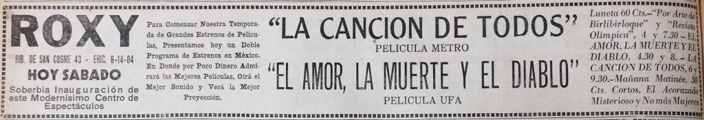 Sólo dos semanas después de la inauguración del Alameda, el 21 de marzo, iniciaron las proyecciones en el Cine Roxy, ubicado en Ribera de San Cosme 43, con un programa doble que incluía la cinta estadunidense La canción de todos (Here Comes the Band, 1935) y la alemana El amor, la muerte y el diablo (Liebe, Tod und Teufel, 1934). Impulsado por la Compañía Mexicana de Cines, cuyo gerente era Miguel Ángel Fernández, este espacio anunciado como “modernísimo centro de espectáculos” se orientó a satisfacer las necesidades de entretenimiento del público del barrio de San Cosme, ofreciéndole buenas películas por el módico precio de sesenta centavos. El periodista con el seudónimo Julián Sorel lo describió como “un magnífico y amplio local acondicionado con todo el confort moderno, incluso clima artificial, de una gran sencillez de líneas, cómodo, elegante y provisto de cuanto pudiera desearse en lo que a higiene y seguridad se refiere”. (El Nacional, 21 de marzo de 1936, p. 6) Su cupo rondaba las mil seiscientas localidades.