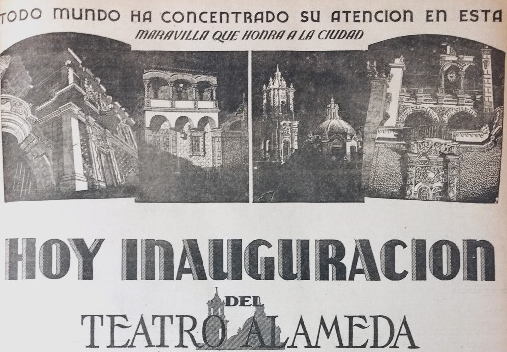 Entrar en el Teatro Alameda y transportarnos automáticamente a una región de ensueño y encantamiento, es todo uno. (…) la suntuosidad del espectáculo no principia ni en el foro ni en las variedades que vamos a admirar, sino en el maravilloso recinto pleno de arrobadora emotividad (…) Podría decirse de este Teatro Alameda, por su confort, lujo e higiene, así como por la selectividad de sus espectáculos, que es el Sanatorio Espiritual que todos anhelamos, cuando fatigados del trabajo del día, vamos en pos de ese momento de tregua y de reposo que ha de devolvernos las fuerzas perdidas. Ya era tiempo de que México tuviera un centro de espectáculos de esta calidad y naturaleza, sin miasmas, sin incomodidades, sin aire viciado y… sin insectos. (Excélsior, 7 de marzo de 1936, p. 3)