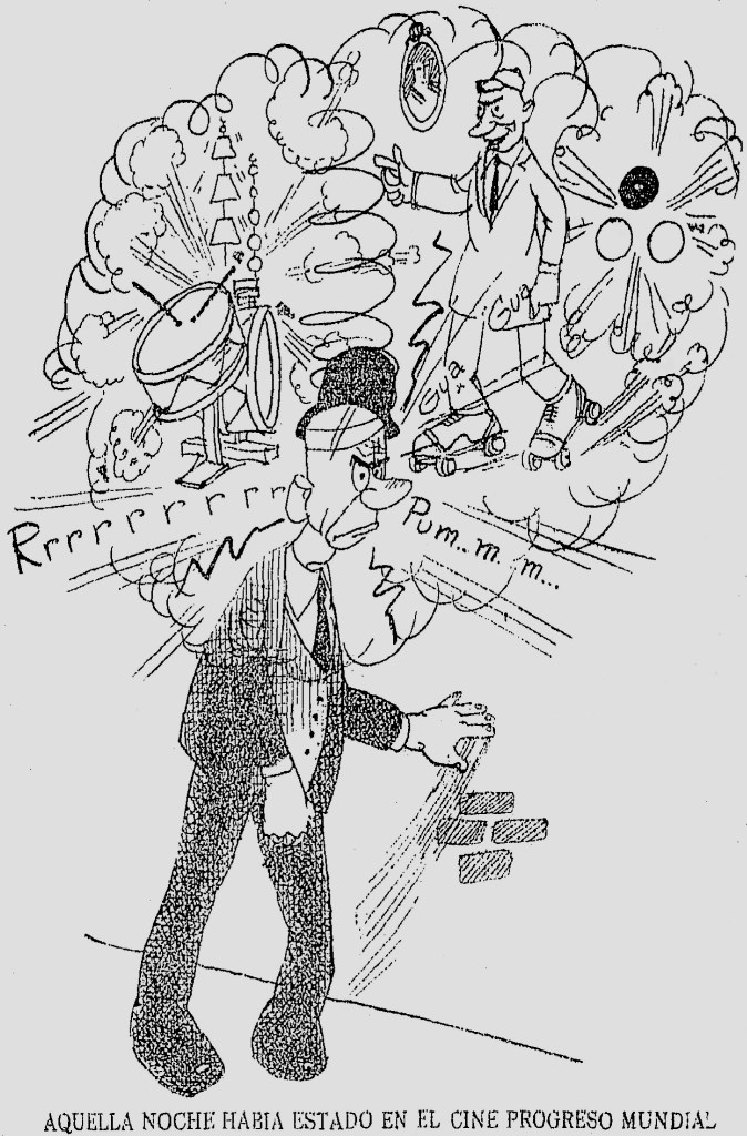 El periodista Marcos Nerón consignó unos días después haber sido uno de los que fueron a la inauguración del nuevo cine. Sólo que ver una película “de suave transcurrir y ternuras bucólicas” se convirtió para él en una “pesadilla infernal”, porque a los números musicales interpretados en vivo por la orquesta dentro de la sala se sumaron invasivos ruidos “de patines que hacen crujir el maderamen; bolas de billar que entrechocan al azar y a destiempo, y bailarines que se mecen al compás del último fox-trot”. Concluía el articulista que había sido una pésima idea del empresario hacer coincidir en salones contiguos todas esas diversiones, que provocaban una mezcla de sonidos tan caótica que los concurrentes al cine salían mareados “como si hubieran hecho loop-the-loop veinte veces en un aeroplano”. (El Mundo, 10 de octubre de 1922, p. 1) El caricaturista del mismo vespertino comentó poco después de forma gráfica lo descrito por su colega en el siguiente cartón: