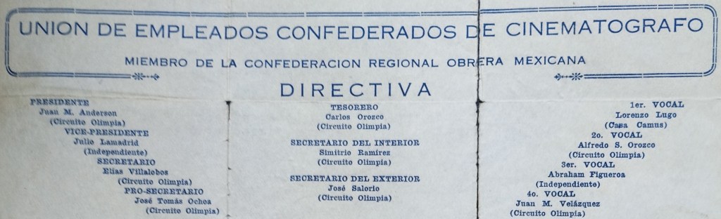A mediados de enero se votó por un cambio en la mesa directiva, designándose como presidente a Juan M. Anderson. Este empleado del Circuito, quien había mostrado elocuencia y dotes de líder, expuso ideas orientadas al fortalecimiento del gremio que “fueron saludadas con un aplauso general”. (Acta 15/02/22) En las semanas siguientes se mandó hacer papelería para los oficios en la que se mostraban los nombres de los integrantes de la mesa directiva, entre los que había trabajadores del Circuito Olimpia, la alquiladora Casa Camus y cines independientes, y se hacía constar que la Unión estaba adscrita a la Confederación Regional Obrera Mexicana (CROM).