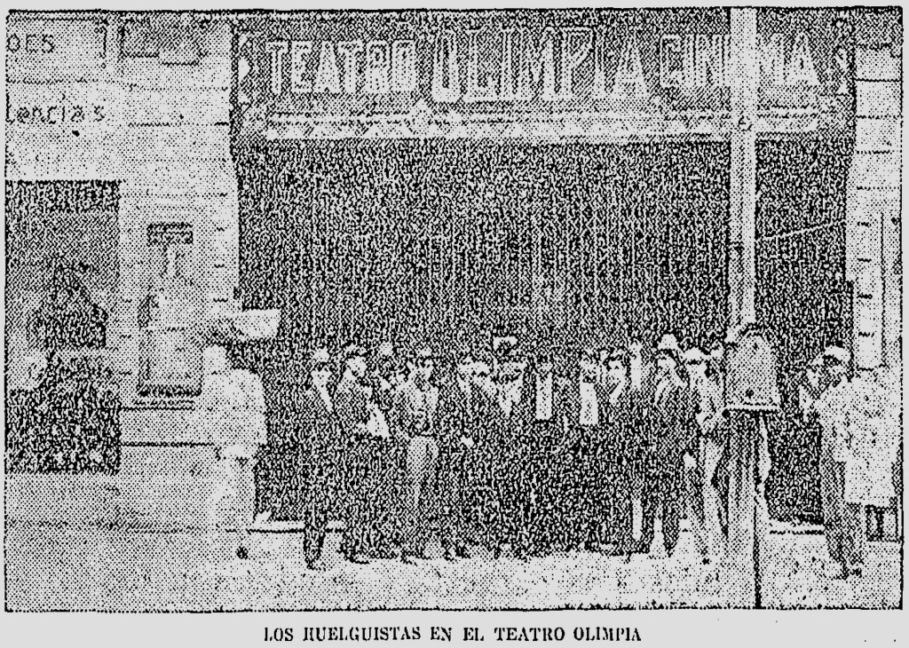 Unas semanas más adelante, la Unión acordó convocar a una huelga en los cines capitalinos. El motivo de este llamado fue la defensa de 19 trabajadores del Circuito Olimpia que habían sido despedidos o se les había bajado el sueldo alegándose “la necesidad de introducir economías” en los negocios. (ED, 19/05/22) Puesto que la empresa no reconocía a la Unión como interlocutora, otra instancia de la CROM representó a esta en la presentación de un pliego petitorio en el que además de solicitarse la reinstalación de los despedidos o indemnizarlos de acuerdo a la ley, se hacían exigencias generales como respetar la jornada de ocho horas y el día de descanso obligatorio, indemnizar a los empleados por accidentes de trabajo y pagar los sueldos en caso de enfermedad; se agregaba el punto de rescindir los contratos de los trabajadores extranjeros o nivelar sus sueldos con los de los mexicanos. Luego de unos días de negociaciones, el Circuito Olimpia aceptó de forma inusitada todas las solicitudes del pliego, además de comprometerse a tratar los asuntos relacionados con su personal “con el Comité Ejecutivo de la Unión, a fin de evitar discordias entre la empresa y sus obreros”. (E, 30/05/22) La huelga no estalló.