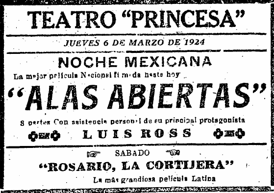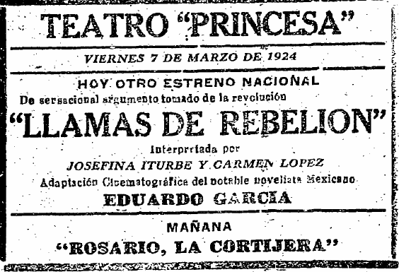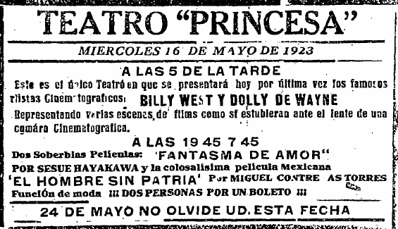 También se exhibieron documentales en el Princesa. Uno, que trataba sobre “los medios empleados para combatir la plaga del gusano rosado en los plantíos de algodón”, pasó en función gratuita promovida por la Cámara Agrícola de La Laguna; el ingeniero José González Calderón, secretario de ese organismo, invitó a que asistieran “todos los agricultores que lo deseen”. (EST, 5/08/1923, p. 1) Otro fue Tampico en su primer centenario, anunciado de esta forma por la empresa de Isauro Martínez: “Para sacar esta película que demuestra el poderío de la ciudad más rica de México, fueron traídos de Los Ángeles técnicos operadores. Vea Ud. la riqueza y el buen gusto con que celebraron los entusiastas tampiqueños su primer centenario.” (EST, 16/08/1923, p. 6) El cine ofreció La historia completa de Francisco Villa (1923), en la que la empresa Rosas Film capitalizó la noticia del asesinato del caudillo duranguense haciendo una recreación de su trayectoria desde que se sumó a las filas de Francisco I. Madero hasta su muerte. (EST, 22/11/1923, p. 5) Y también se exhibió ahí Eclipse total de sol, producida por el Observatorio Astronómico y Meteorológico Nacional y filmada por Ramón Alva, que no sólo resultaba atractiva por el suceso registrado, sino también porque se había hecho en las inmediaciones de la estación Yerbanis del ferrocarril entre Torreón y Durango; su anuncio decía: “se admiran todas las fases del fenómeno; los campamentos de los sabios astrónomos americanos, alemanes y mexicanos; los trenes de excursionistas y todo lo más interesante de este acontecimiento”. (EST, 20/02/1924, p. 4)