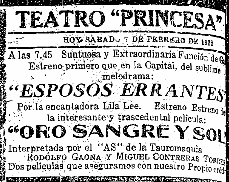 El entusiasmo que despertó la primera oleada de cine de ficción mexicano, que se reflejó en La Laguna con el estreno de una veintena de cintas entre 1917 y 1923, disminuyó de forma considerable al mediar la segunda década del siglo. En efecto, en 1924 se pusieron en la región sólo dos obras mexicanas de argumento y tres en 1925. Para entonces era evidente que las pequeñas productoras asentadas en la Ciudad de México no habían alcanzado a impulsar una industria con estudios y estrellas reconocidas por amplios sectores de público. Por eso, curiosamente, la figura que destacó en las proyecciones de cine nacional en la región fue la del torero Rodolfo Gaona, cuya efigie apareció en dos de esas cintas: Oro, sangre y sol (Miguel Contreras Torres, 1923) y El último día de un torero (Rafael Trujillo, 1925).