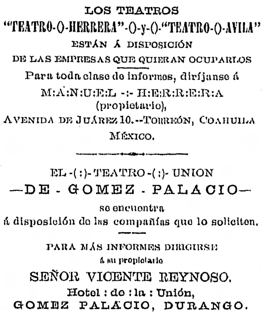 Un acontecimiento relevante para la localidad fue la presentación en diciembre de 1900 de la compañía de zarzuela de Vicente A. Galicia, en la que participaban las tiples Josefina Vélez, Columba Quintana, Josefina Peral, Sofía Haller y Eloísa Ávila, y que representó Gigantes y cabezudos, La fiesta de San Antón y España en París. Probablemente ya para entonces el Teatro Ávila había cambiado de administración, pasando a manos de Manuel Herrera, también propietario del Teatro Herrera de Torreón. Lo que parece seguro es que estos dos recintos, junto con el Teatro Unión de Gómez Palacio, recibieron a partir de entonces a los empresarios Carlos Mongrand, Enrique Rosas y Salvador Toscano, quienes junto con otros exhibidores itinerantes menos conocidos, difundieron entre los laguneros el novísimo espectáculo de las imágenes en movimiento.