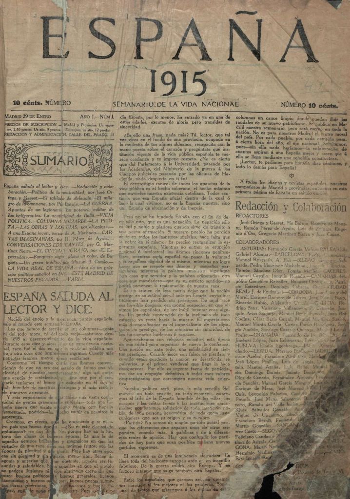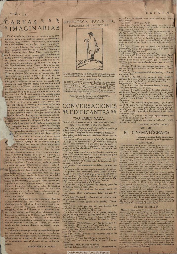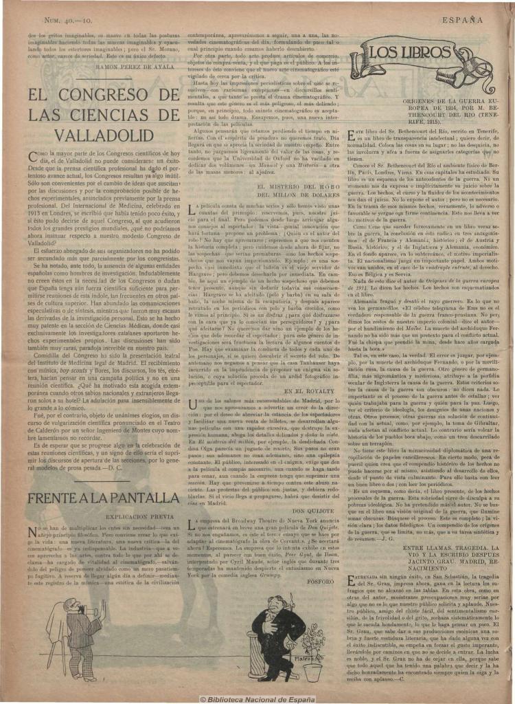 En España este proceso de irrupción colectiva del periodismo cinematográfico seguramente se dio de modo similar. Una de las publicaciones donde comenzó a aparecer crítica fue en el “Semanario de la vida nacional” España, creado en enero de 1915 por José Ortega y Gasset, Pío Baroja, Ramiro de Maeztu y otros intelectuales de o cercanos a la llamada Generación del 98. Desde su primer número, España incluyó la columna “El Cinematógrafo” a cargo de El Espectador, es decir de Federico de Onís. El incipiente crítico no tuvo mayor continuidad y la revista quedó sin colaboraciones sobre cine durante varios meses. Pero a fines de octubre y hasta fin de año, cuando España dejó de aparecer, acogió en sus páginas la columna “Frente a la pantalla”, firmada por Fósforo, seudónimo que, como se sabría tiempo después, enmascaraba a dos mexicanos exiliados en Madrid: Alfonso Reyes y Martín Luis Guzmán.