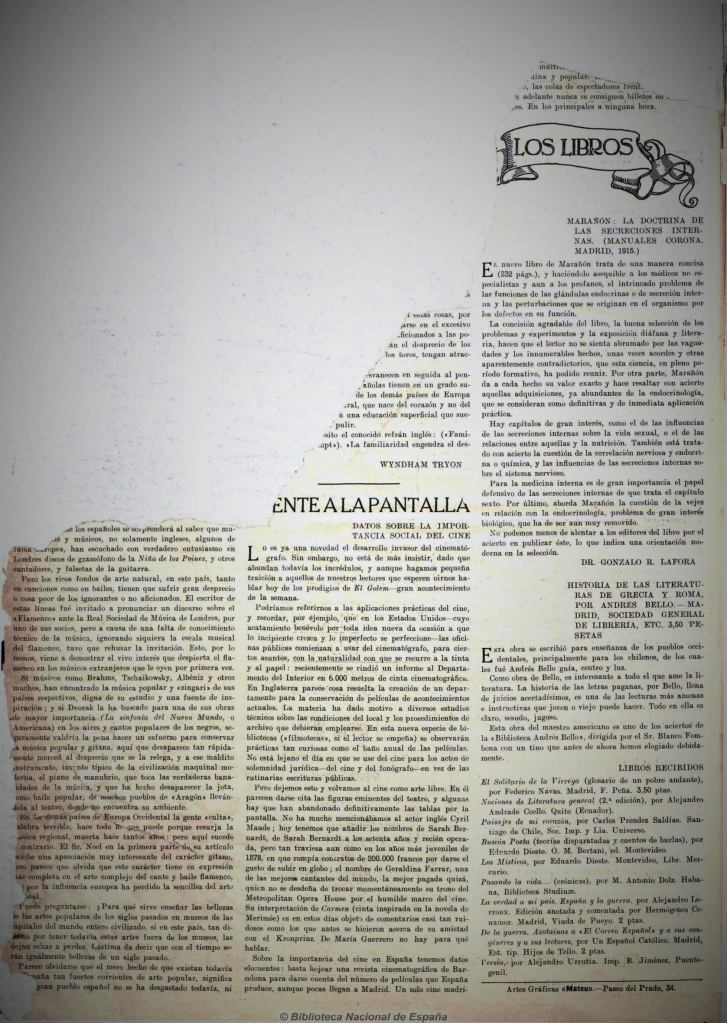 Lo primero que puede subrayarse es que tanto Guzmán como Reyes tuvieran el impulso de recoger como obra de escritura personal textos que habían sido sobre todo instrumentos de supervivencia económica. Los jóvenes exiliados, que en 1915 celebraron sus cumpleaños 27 (Guzmán) y 25 (Reyes), tenían necesidades apremiantes, por lo que deben haber visto con alivio y agradecimiento la oferta de los redactores de España para hacer semanalmente la columna “Frente a la pantalla”. Se trataba de un trabajo no muy demandante y que estaba al alcance de lo que se sentían capaces de hacer. Pero una vez puestos a realizarlo lo hicieron con tales gusto e interés que pocos años más adelante lo reivindicaron en uno de los momentos iniciales de su respectiva construcción como autores de libros.