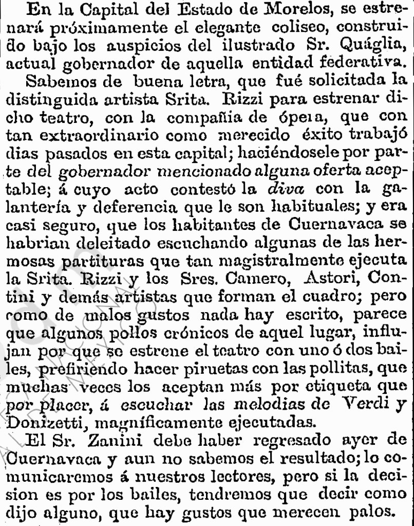 Entre 1880 y 1884 Carlos Quaglia gobernó el estado de Morelos. Justo a la mitad de su mandato se dieron dos acontecimientos relevantes al promulgarse una nueva constitución estatal e inaugurarse un elegante teatro en el centro de Cuernavaca. Como a otros en el país, se lo llamó Teatro Porfirio Díaz para halago del caudillo oaxaqueño. La edificación del recinto estuvo a cargo del español Domingo A. Nandín, quien después de haberlo concluido fue contratado por la Secretaría de Fomento para construir y mantener el tramo de camino carretero entre Cuernavaca y el río Amacuzac, pasando por el centro de las haciendas de Temixco, El Puente y San Gabriel, y los pueblos de Alpuyeca, Xochitepec, Puente de Ixtla y Amacuzac (La Voz de México, 1 de septiembre de 1882, p. 2). Cuando el teatro estaba cerca de ser inaugurado, apareció en la prensa una nota que, bajo el título de “Pésimo gusto”, decía: