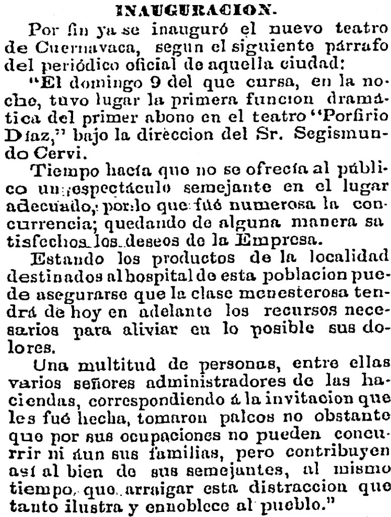 Los trámites se alargaron y se perdió la oportunidad de que el recinto fuera inaugurado por la compañía regenteada por Giovanni (o Juan) Zanini, italiano avecindado en la capital y promotor de espectáculos operísticos durante la segunda mitad del siglo XIX. Tampoco prevaleció la opinión de los “pollos crónicos” cuernavacenses y acabó siendo la empresa de Segismundo Cervi la que, el 9 de abril de 1882, dio la función inaugural, en la que se representó la comedia El músico de la murga de Enrique Pérez Escrich: