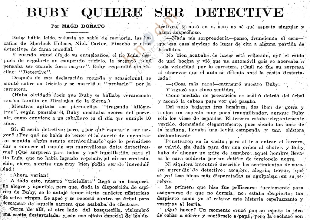 El trabajo escénico en México de Magda Donato relegó una escritura personal que en su periodo español había dado lugar a la publicación de las narraciones La carabina (1924) y Las otras dos (1931), y de la farsa cómica ¡Maldita sea mi cara! (1929), amén de numerosos textos periodísticos reunidos y comentados por Margherita Bernard en Reportajes (Editorial Renacimiento, 2009). También Donato publicó entonces cuentos como el encantador “Buby quiere ser detective” reproducido abajo, que probablemente salió en una revista peninsular antes de aparecer en el número de enero-febrero de 1925 de Elegancias, dirigida desde un par de años antes en la capital mexicana por el periodista español Pacífico Redondo (Don Quieto).